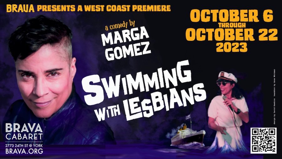 Swimming With Lesbians will be presented October 6 – October 22, 2023, with Friday, Saturday, Sunday performances. Showtimes are 7:30 pm Fridays and Saturdays and 5:00 pm Sundays at Brava Cabaret, 2773 24th St., San Francisco. Tickets are $25. For more information or to order tickets, the public may visit www.Brava.org
